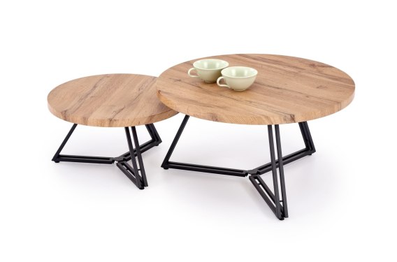 Wymiary: 75/41 cm oraz 55/31 cm, zestaw 2 ław, materiał: MDF okleinowany / stal malowana proszkowo, kolor: dąb złoty - czarny