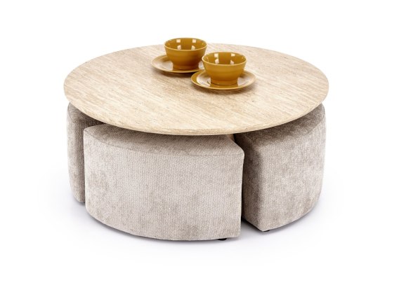 Wymiary: 80/36 cm, ława z 4 pufami, materiał: MDF okleinowany / tkanina, kolor: trawertyn - jasny beż