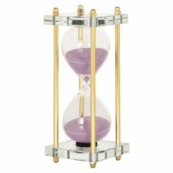 Subtelne złote elementy konstrukcji harmonijnie współgrają z transparentnym szkłem oraz delikatnym fioletowym piaskiem, który odmierzając czas, tworzy uspokajający efekt wizualny. Produkt dostępny jest w dwóch rozmiarach, co pozwala na dopasowanie go do różnych aranżacji wnętrz.