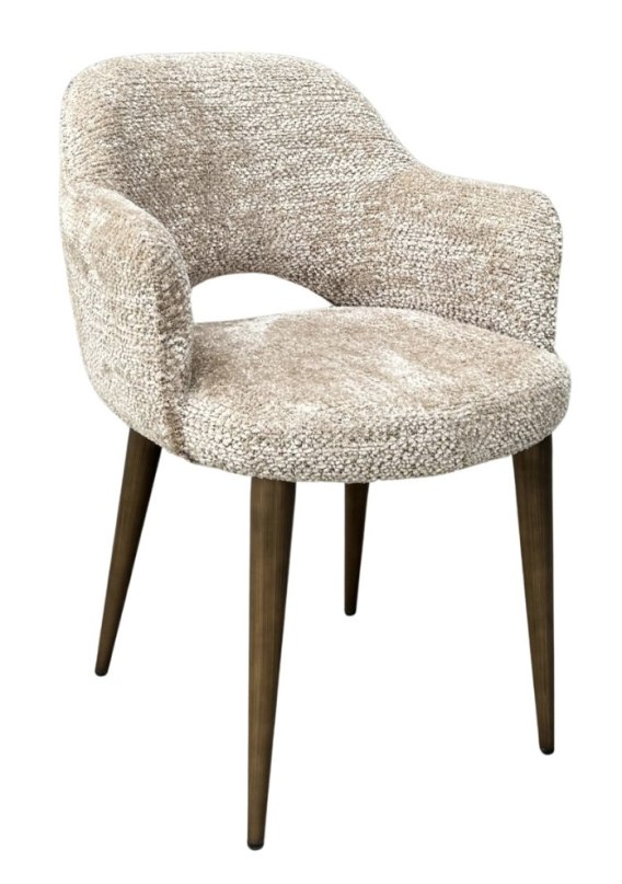 Opływowy kształt i przytulna, miękka w dotyku tapicerka w naturalnym odcieniu beżu tworzą przyjazną i stylową atmosferę przy stole.