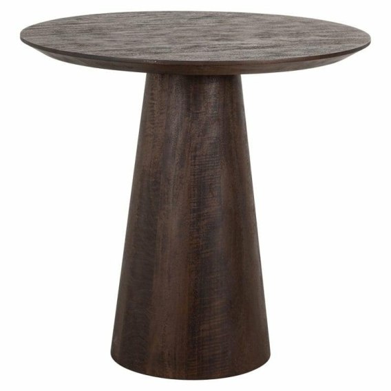 Okrągły blat z drewna mango w kolorze ciemnego brązu dodaje mu szlachetności i ciepłego, naturalnego wyglądu.