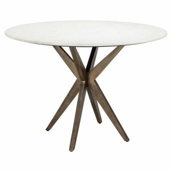 Okrągły blat zdobi piękny, elegancki marmur w jasnej tonacji.