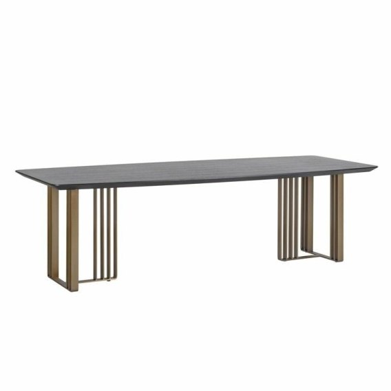 Blat, wykonany z MDF pokrytego fornirem dębowym w odcieniu węgla drzewnego, zachwyca stylowym wyglądem, jednocześnie zapewniając trwałość i odporność na codzienne użytkowanie. Złote wykończenie stalowej podstawy dodaje całości nuty luksusu i wyjątkowego charakteru.