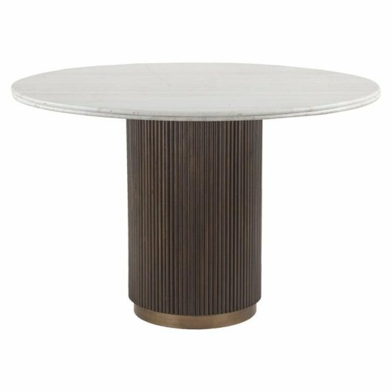 Piękny, okrągły blat zdobi biały marmur Morchana, a podstawę ciemnobrązowe drewno zakończone eleganckim metalowym akcentem.