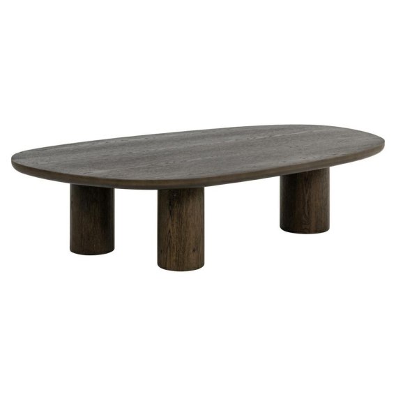 Wykonany z płyty MDF i drewna z recyklingu, pokryty eleganckim fornirem dębowym, zachwyca ciemnym, głębokim kolorem i nieregularnym, organicznym kształtem blatu.