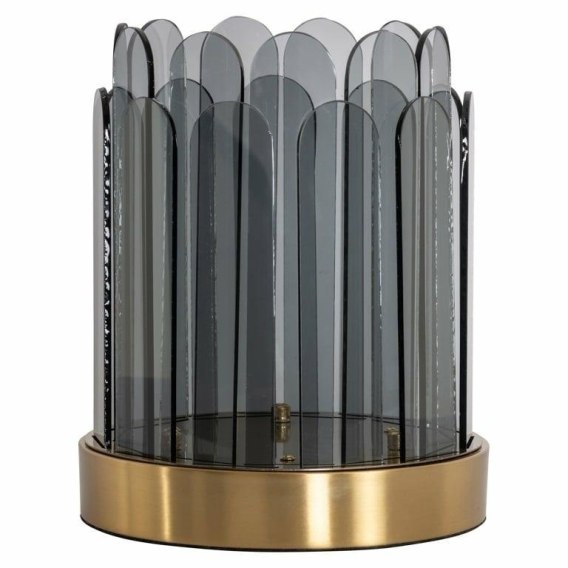 Świecznik Daisey to elegancki dodatek, który wyróżnia się połączeniem dymionego szkła oraz złotych elementów wykonanych z metalu i mosiądzu.