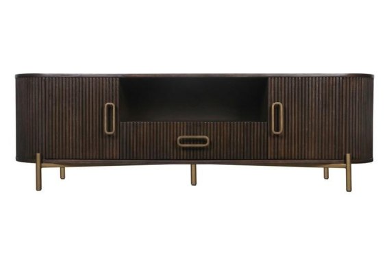 Szafka RTV Luxor jest szczególnie wyjątkowa dzięki eleganckim lamelom połączonym z drewnem dębowym oraz metalowymi złotymi uchwytami.